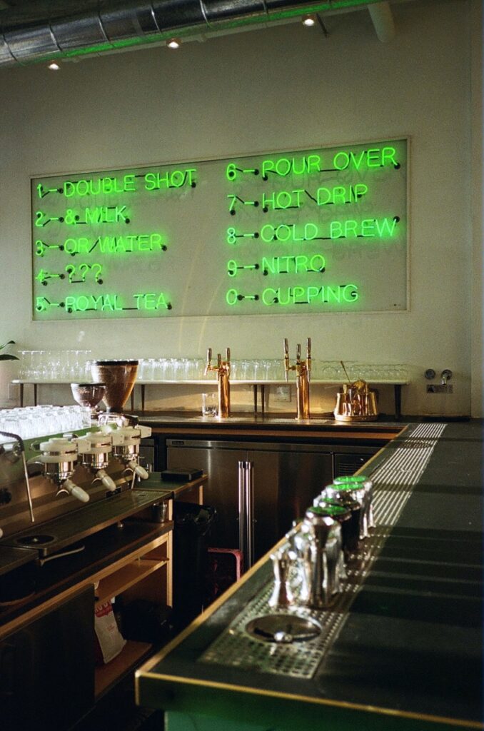 From the furniture and lighting to the decor and layout, every aspect of café design should work together to create a cohesive and inviting atmosphere. The signature neon menu above the bar at All Day is just one example of how unique design elements can become an iconic symbol of a coffee shop—and even a favorite among customers. When you look through Blank Slate’s tagged Instagram photos, you’ll find shots with pops of their signature bright green in everything from their decor to coffee mugs. On the other hand, All Day’s feed is filled with photos highlighting their iconic neon menu, along with lots of nice plant shots and printed menus that look straight out of a fashion magazine.