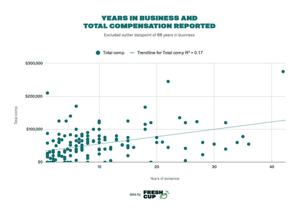 This weak correlation indicates that we generally cannot assume that being in business longer will result in higher compensation. In fact, the data showed there were coffee businesses that have been around for 20 or more years where the owner makes under $100K, as well as businesses ten years or older where the owners take little or no income. Other factors likely play a more significant role in determining compensation levels.